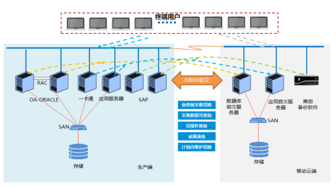在灾备环境中使用多台实体机或虚拟化环境作为容灾服务器,容灾服务器上需安装与应用服务器、数据库服务器相同的运行环境(操作系统、应用系统程序、数据库等)。针对除上述系统以及SAP系统之外的业务系统,在移动云端建设容灾环境(仅应用服务器),在生产服务器和灾备服务器上安装DBRA全业务容灾系统,用来实时同步生产端数据至灾备环境。