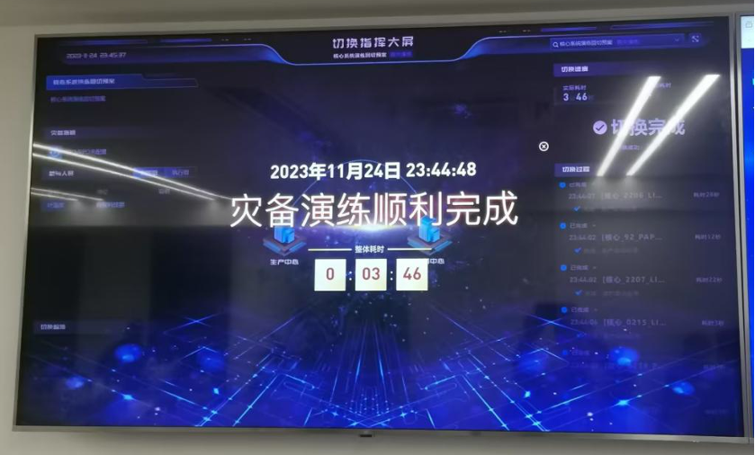 切换后,业务人员充分验证异地灾备系统的数据完整性和业务可用性,执行小组于当晚23点41分进行一键业务回切,仅耗时3分46秒完成业务恢复。