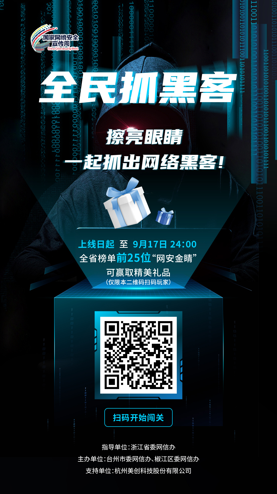 浙江省委网信办、台州市委网信办和椒江区委网信办联合推出,杭州英国上市公司365股份有限公司支持的“垦荒牛大冒险”“全民抓黑客”两款全民互动小游戏,通过游戏闯关+知识问答带你进入充满挑战与乐趣的网安探险之旅。不仅能获得紧张刺激的游戏闯关体验,还能与全省网友同台比拼网安知识,打榜赢取精美礼品。